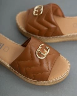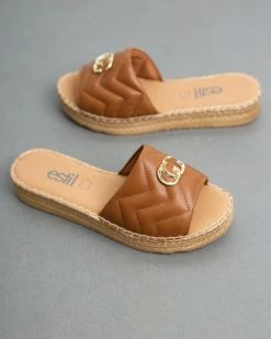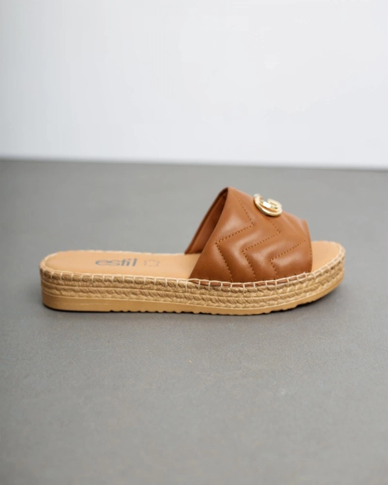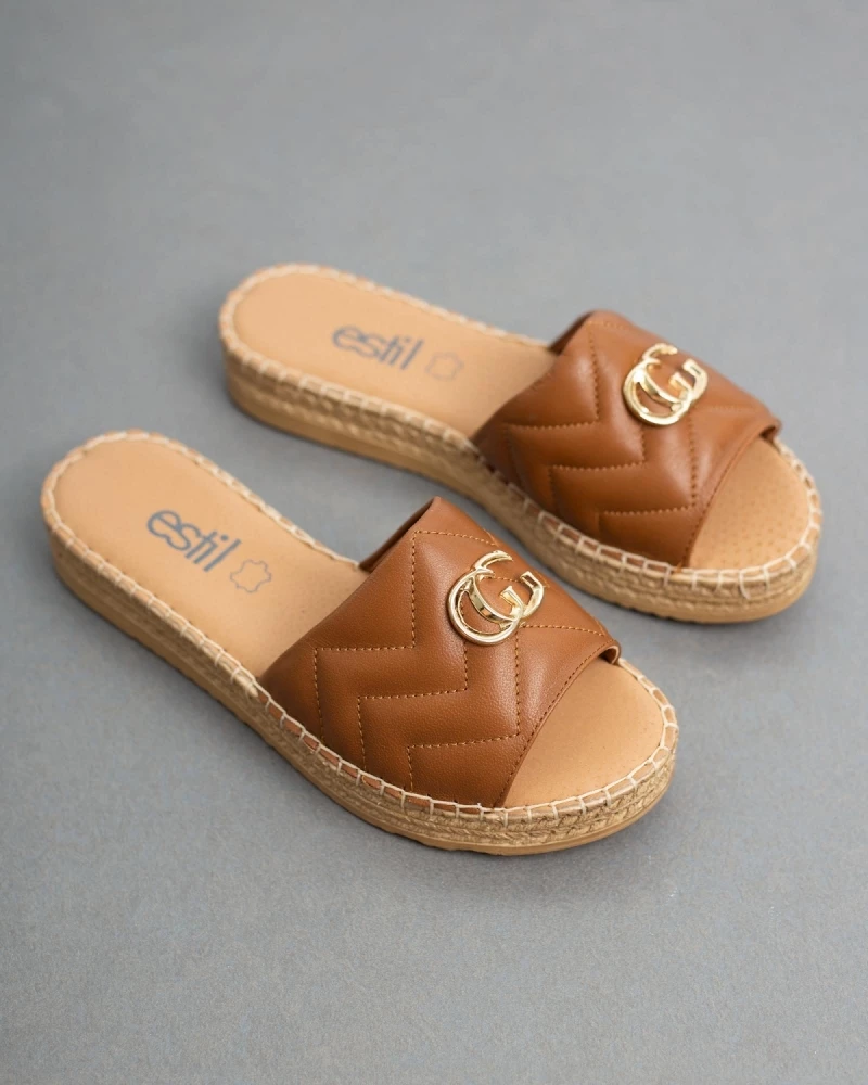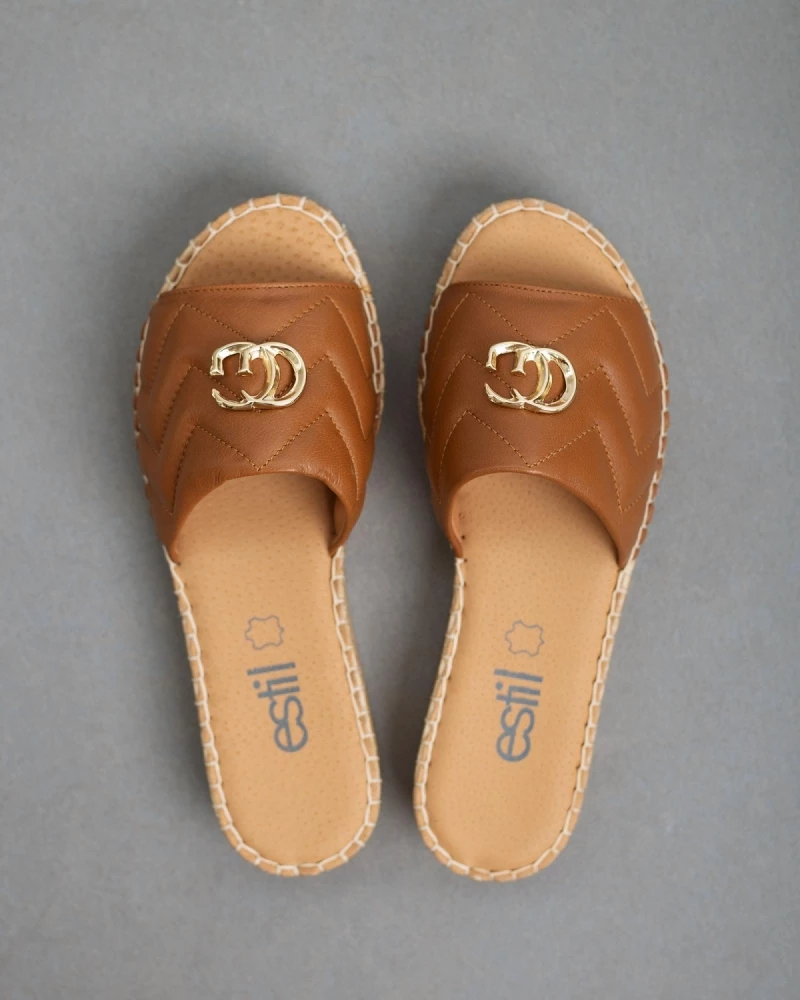 Estil δερμάτινα flatforms με φαρδιά καπιτονέ φάσα.Έχουν μεταλλικό στοιχείο σε χρυσό χρώμα.Ο πάτος είναι δερμάτινος με ενίσχυση.