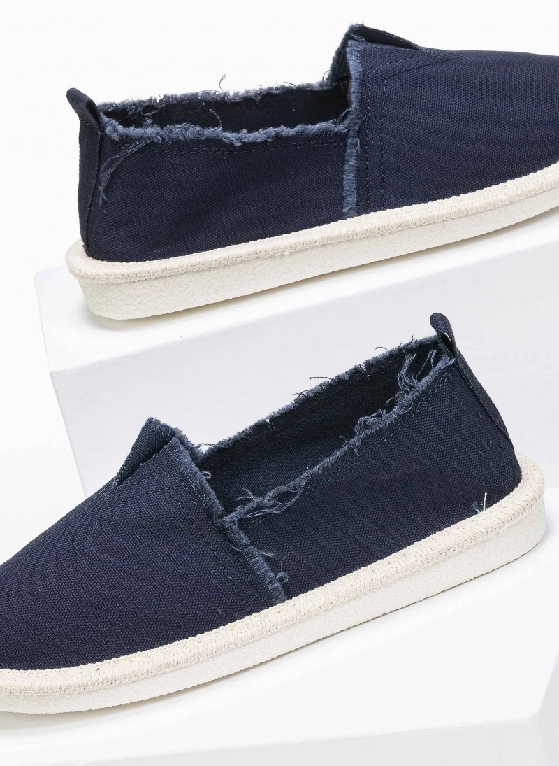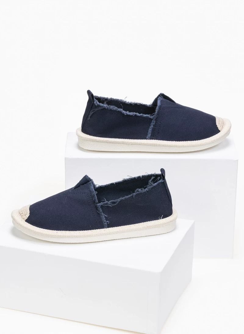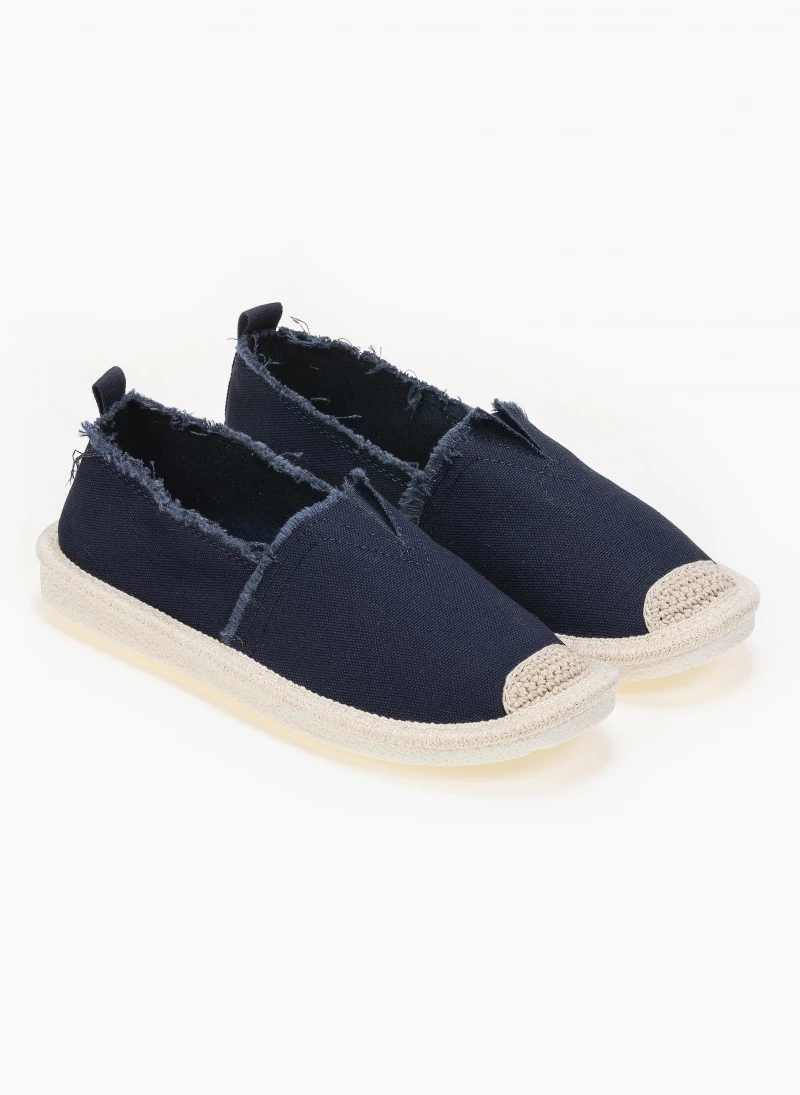 Εσπαντρίγιες από denim ύφασμα με ξέφτια στο τελείωμα.Έχουν εξωτερική ραφή και μαλακή σόλα.Διαθέτουν διακριτικό λάστιχο στο κουτεπιέ για καλύτερη εφαρμογή.