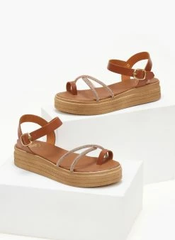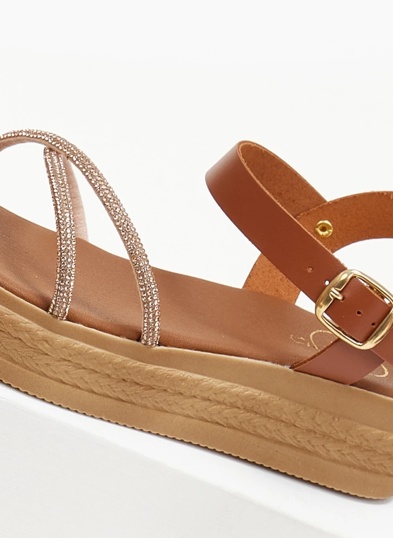 Flatforms δερμάτινα TFP με strass χιαστί λουράκια. Διαθέτει λουράκι στο ύψος του αστραγάλου που δένει με κούμπωμα. Δερμάτινος πάτος με ενίσχυση. Ελληνικής κατασκευής.