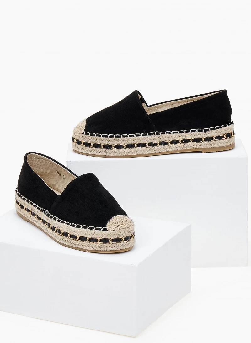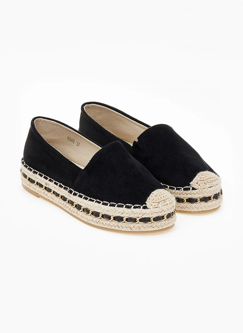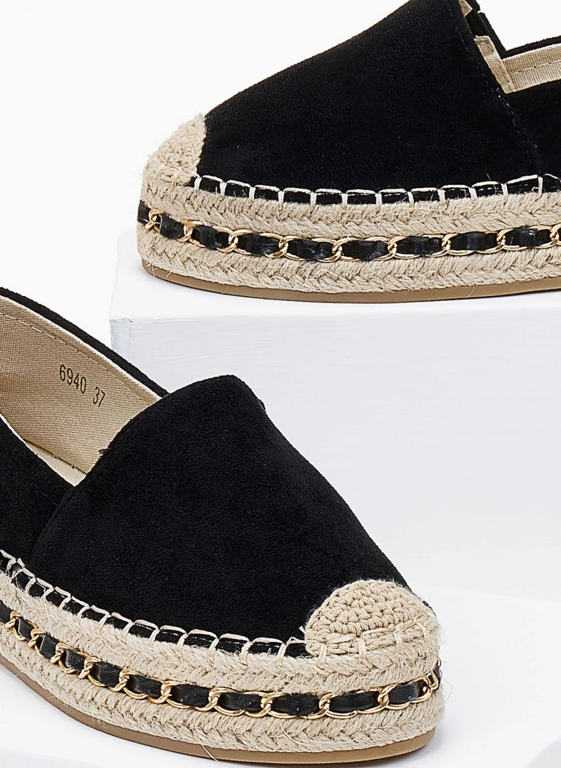 Εσπαντρίγες suede δίπατες.Η σόλα τους είναι με σχοινί και υπάρχει περασμένη διακοσμητική αλυσίδα με λουράκι δερματίνης.Διαθέτουν διακριτικό λάστιχο στην εσωτερική τους πλευρά.