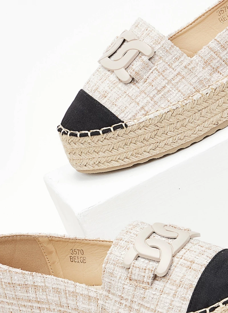 Εσπαντρίγιες από τουίντ ύφασμα με διακριτική μεταλλική κλωστή.Έχουν ματ μεταλλικό διακοσμητικό στο ίδιο χρώμα.Η σόλα είναι διπλή από σχοινί.