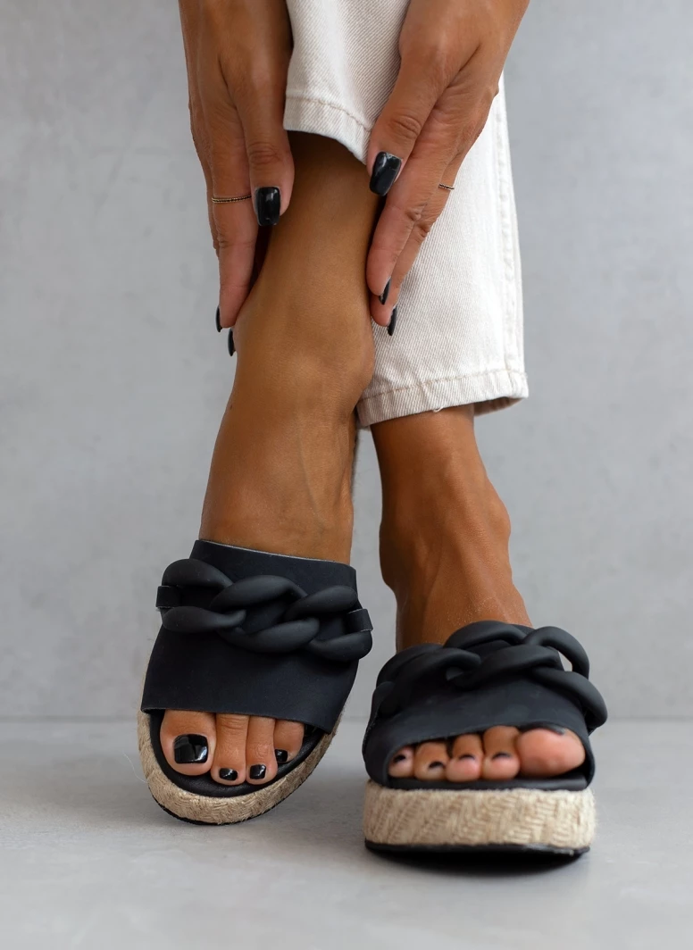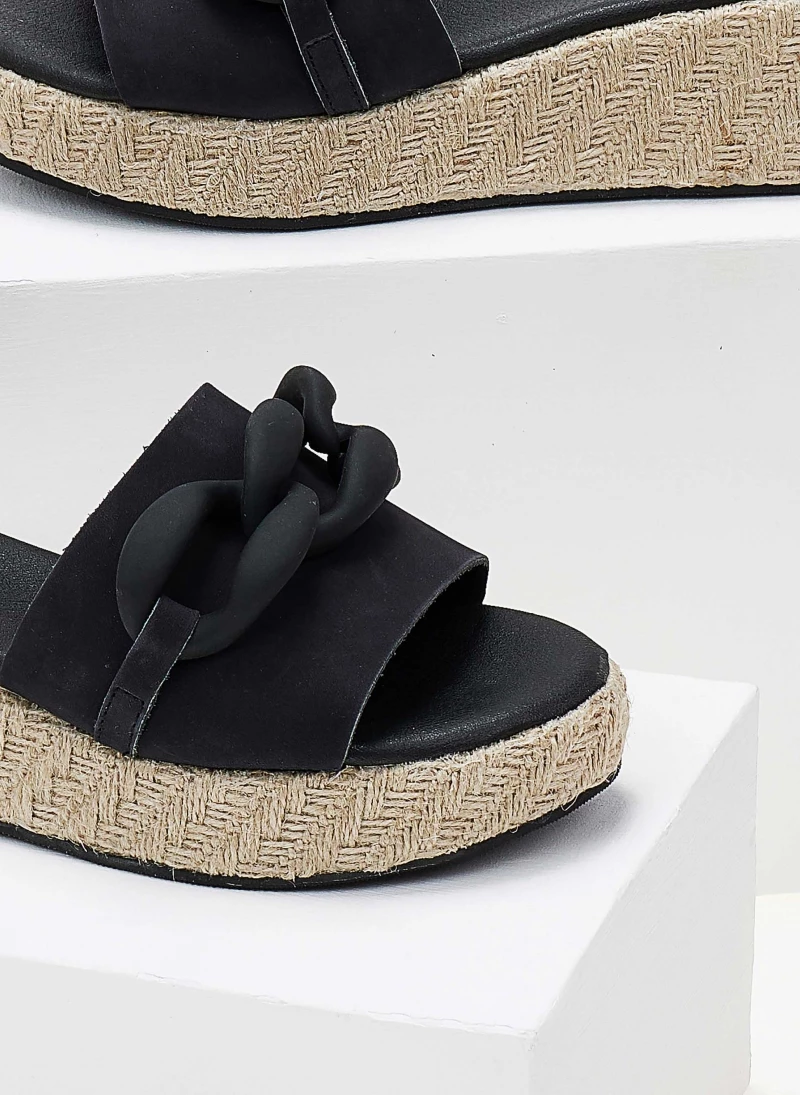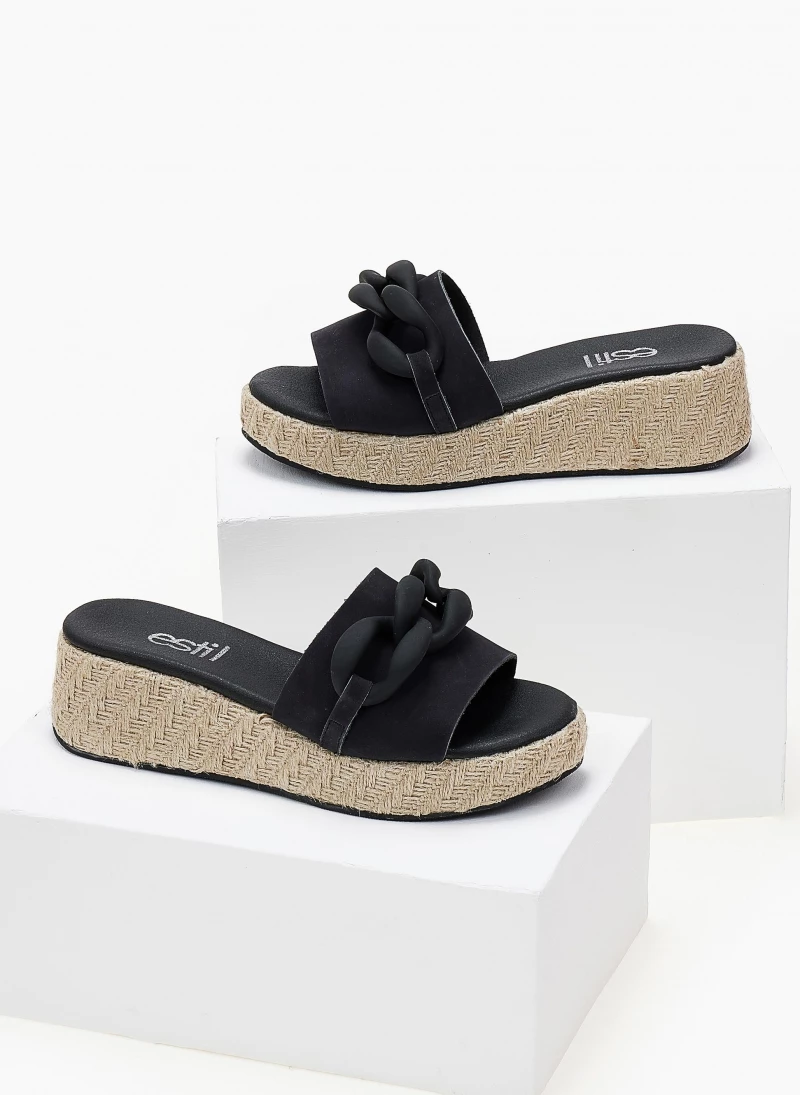 Πλατφόρμες Estil από nubuck δέρμα. Έχουν φαρδιά φάσα με κοκάλινη αλυσίδα σε ματ χρώμα. Δερμάτινος πάτος με ενίσχυση. Η σόλα είναι ντυμένη με σχοινί. Ελληνικής κατασκευής.