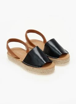 Εσπαντρίγιες δερματίνη με ανάγλυφο pattern. Έχουν σχοινί στη σόλα. Ανοιχτό πίσω μέρος με λουράκι. Μικρό άνοιγμα στη μπροστινή πλευρά.