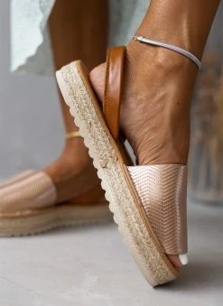 Εσπαντρίγιες δερματίνη με ανάγλυφο pattern. Έχουν σχοινί στη σόλα. Ανοιχτό πίσω μέρος με λουράκι. Μικρό άνοιγμα στη μπροστινή πλευρά.