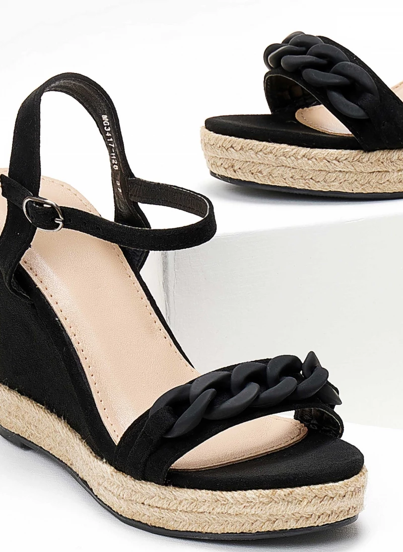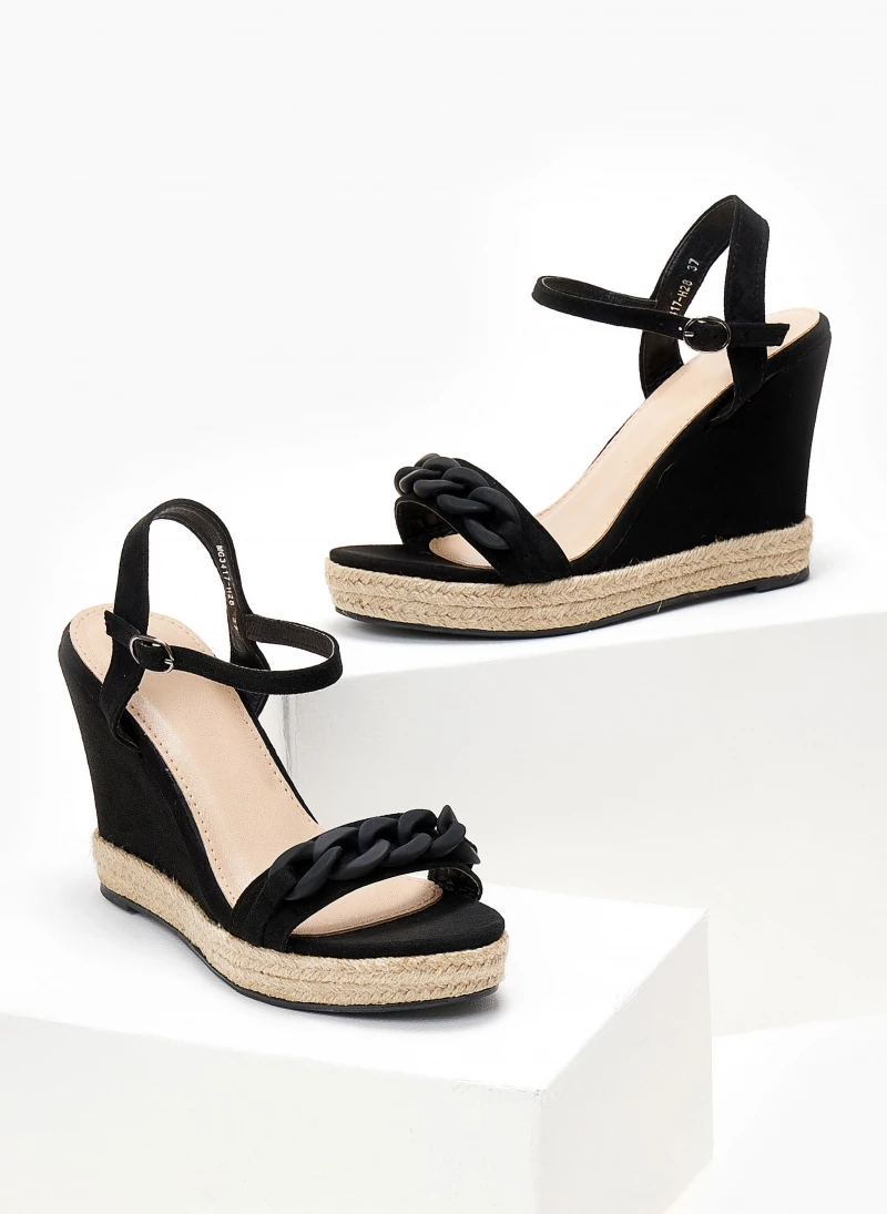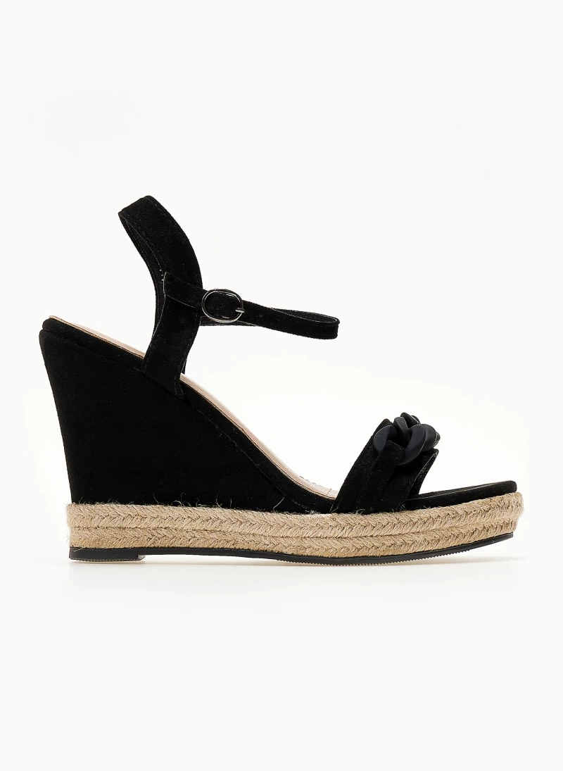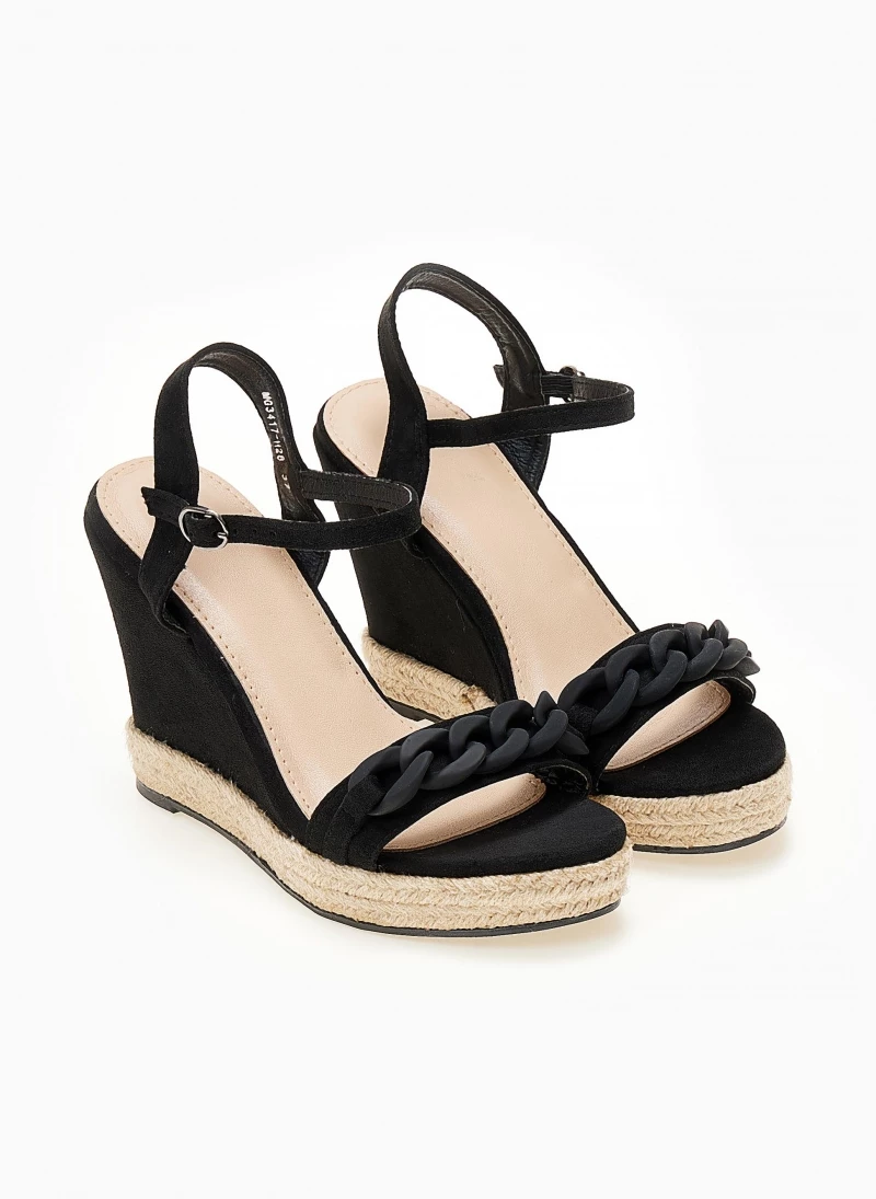 Πλατφόρμες suede με κοκάλινη αλυσίδα. Έχουν λεπτομέρεια σχοινί στη σόλα. Δέβουν με μπαρέτα στο ύψος του κουτεπιέ.