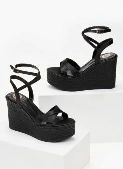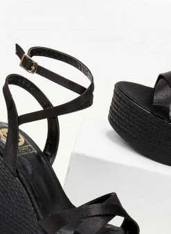 Πλατφόρμες πέδιλα σατέν με δέσιμο χιαστί. Δένουν στο πλάι του αστραγάλου. Ελληνικής κατασκευής.