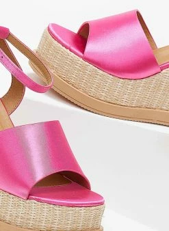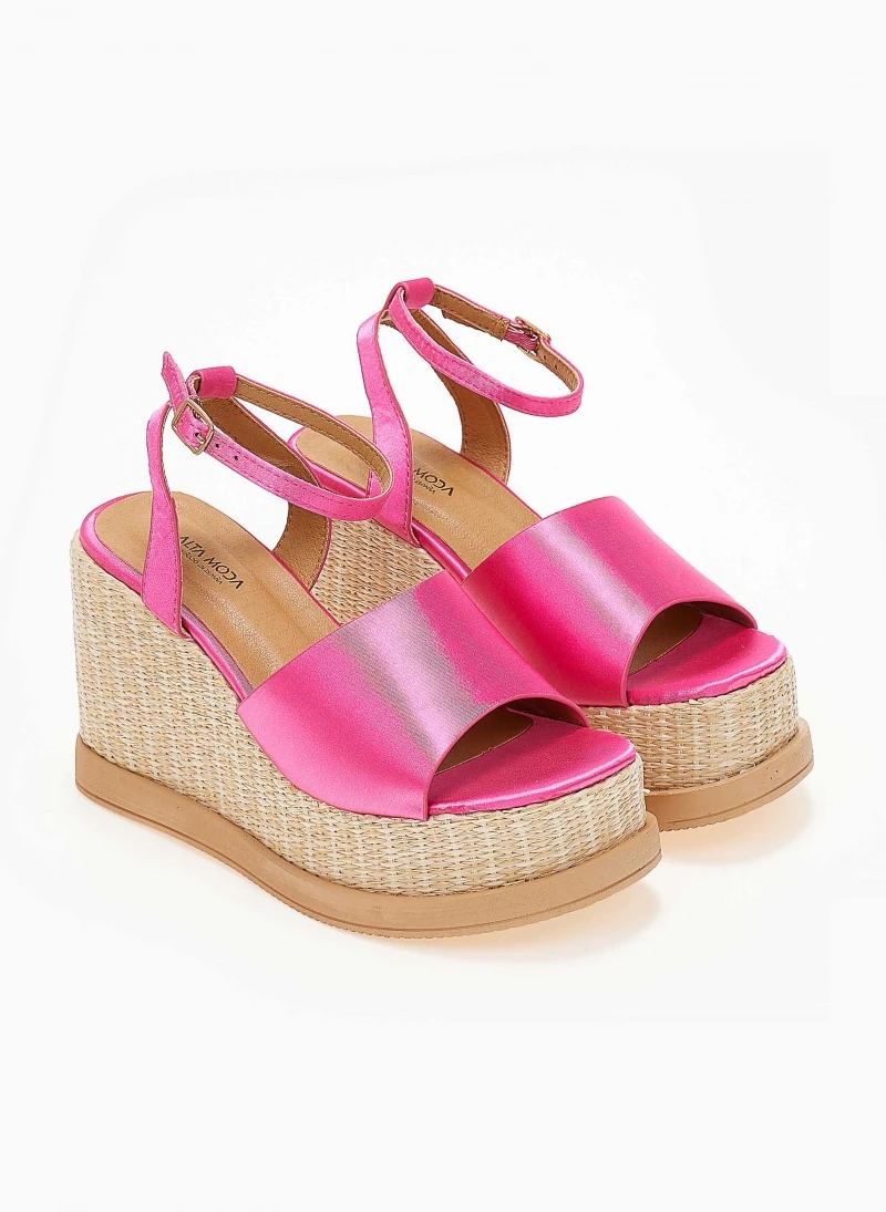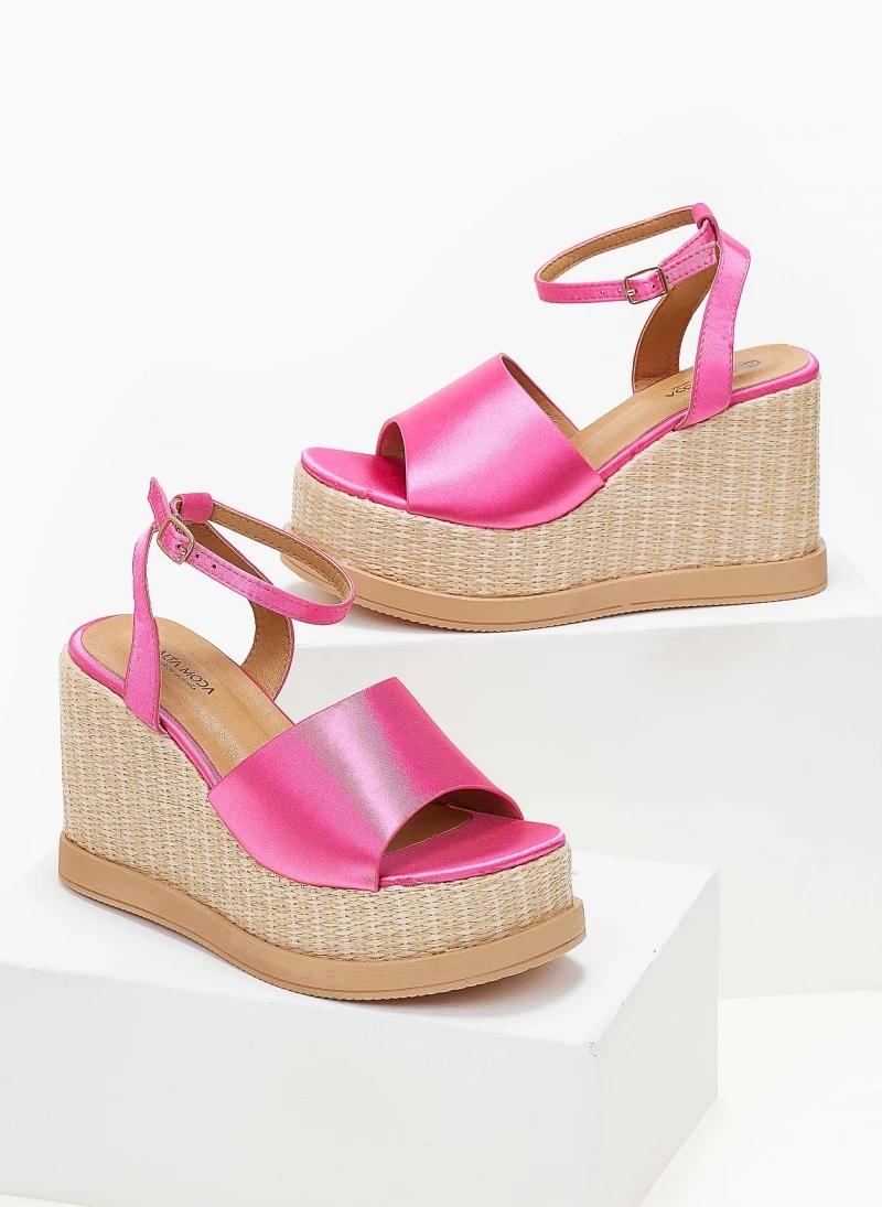 Πλατφόρμες σατέν με φαρδιά φάσα. Έχουν ψηλή σόλα από ψάθα. Δένουν με μπαρέτα στο ύψος του αστραγάλου.