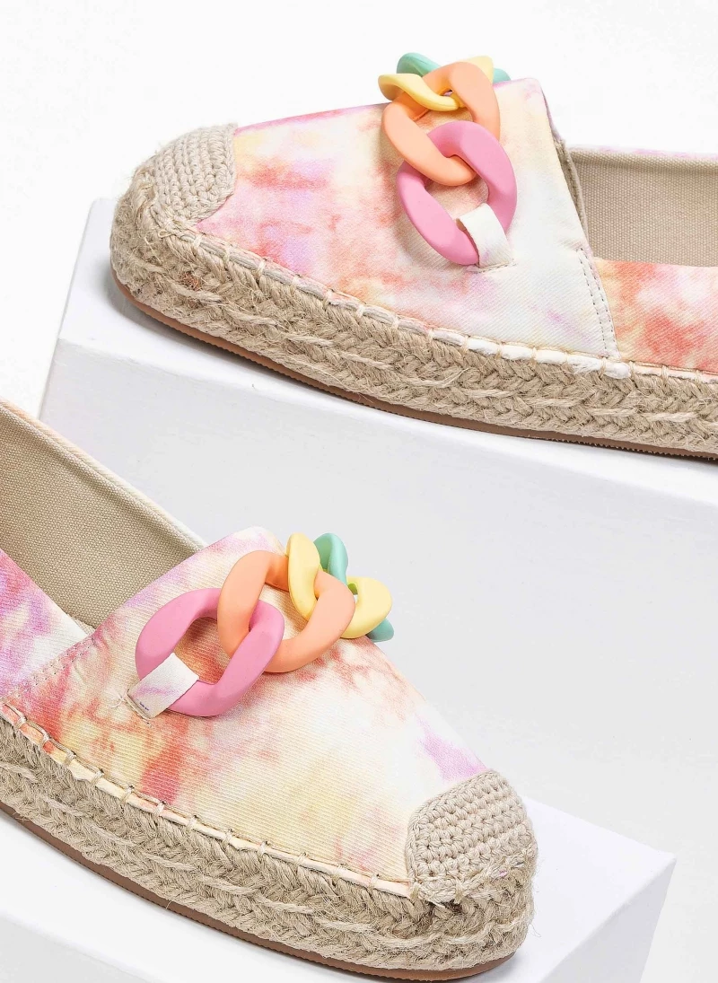 Υφασμάτινες εσπαντρλιγιες σε συνδυασμό χρωμάτων.Έχουν κοκκάλινο πολύχρωμο διακοσμητικό σε σχέδιο αλυσίδα.Σχοίνινη σόλα.