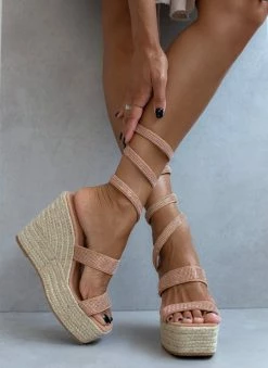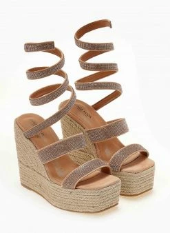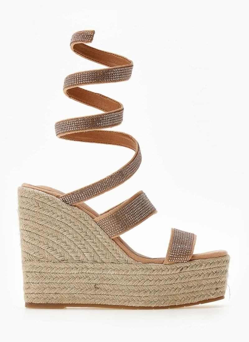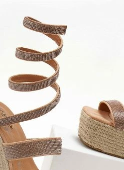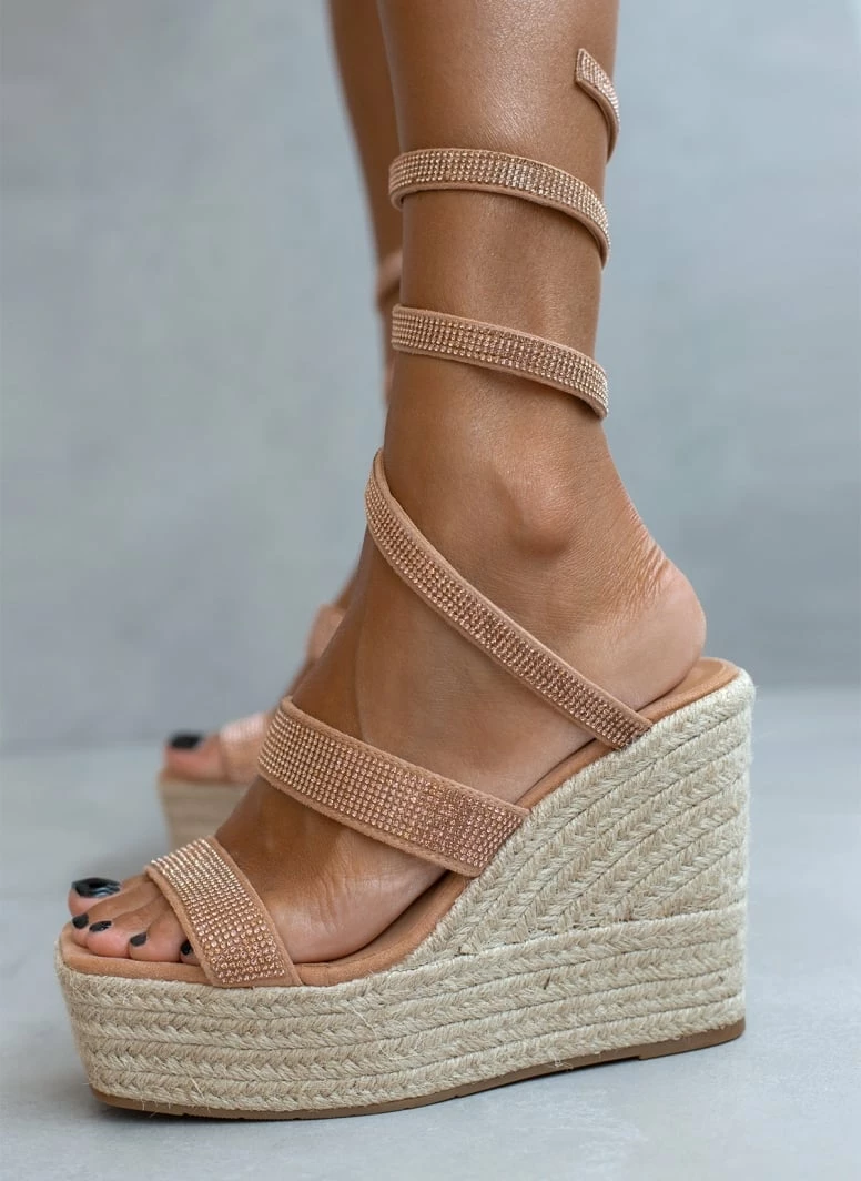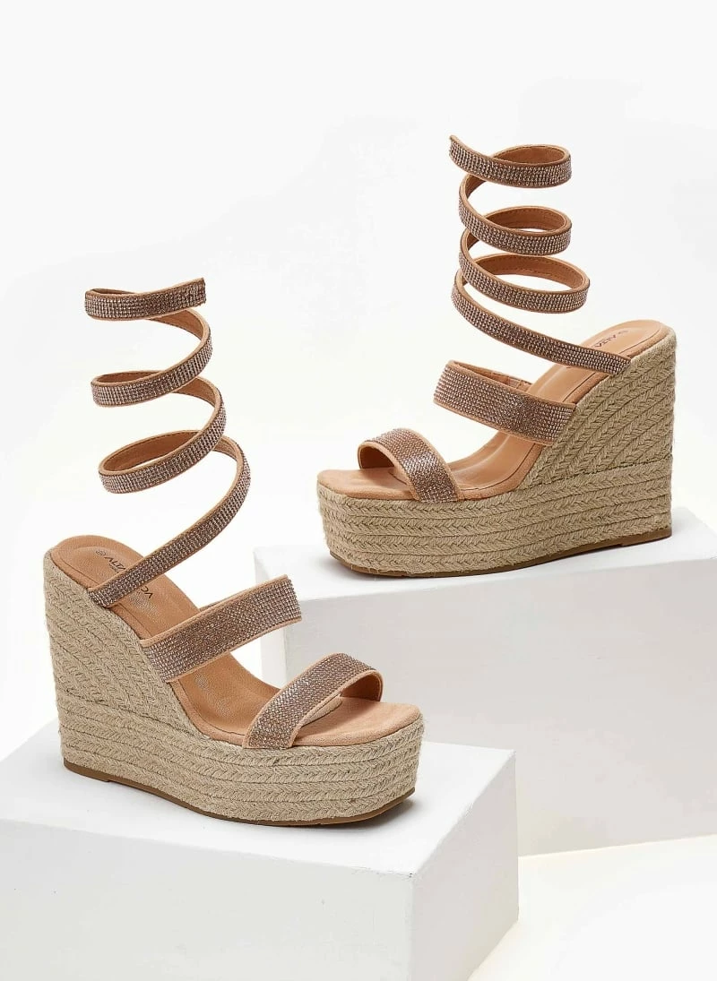 Πλατφόρμες με strass στις φάσες. Έχουν σπιράλ λουράκι με strass στο ύψος της γάμπας. Η σόλα είναι ντυμένη με σχοινί. Στην εσωτερική τους πλευρά έχουν διακριτικό λάστιχο για καλύτερη εφαρμογή. Καρέ γραμμή.