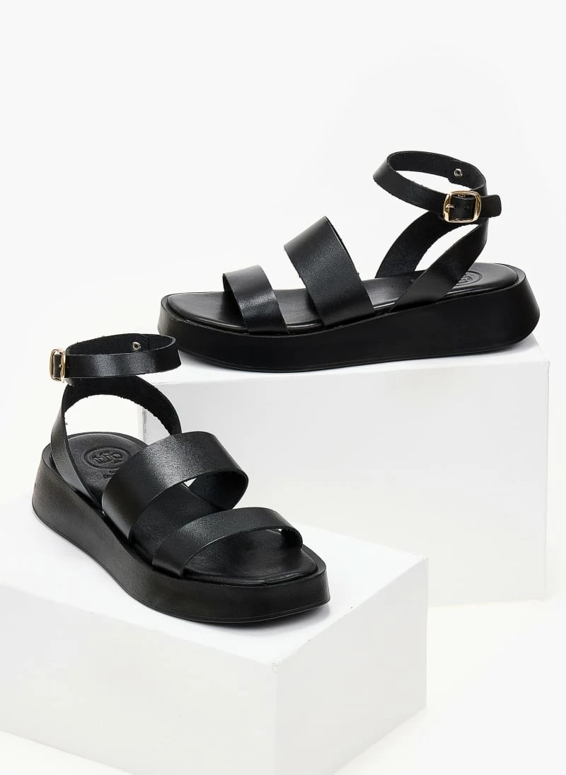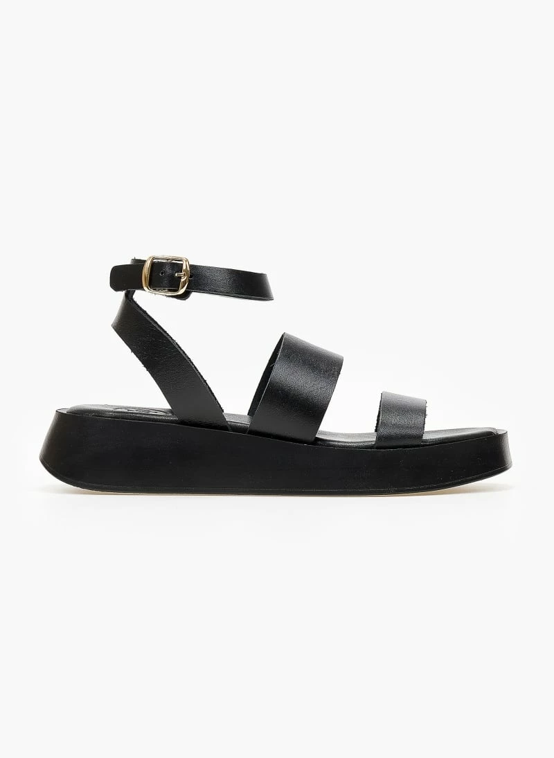 Σανδάλια δερμάτινα TFP με φάσες και ψηλή σόλα. Δένουν με μπαρέτα στο ύψος του αστραγάλου. Έχουν μαλακό δερμάτινο πάτο με ενίσχυση. Ελληνικής κατασκευής.
