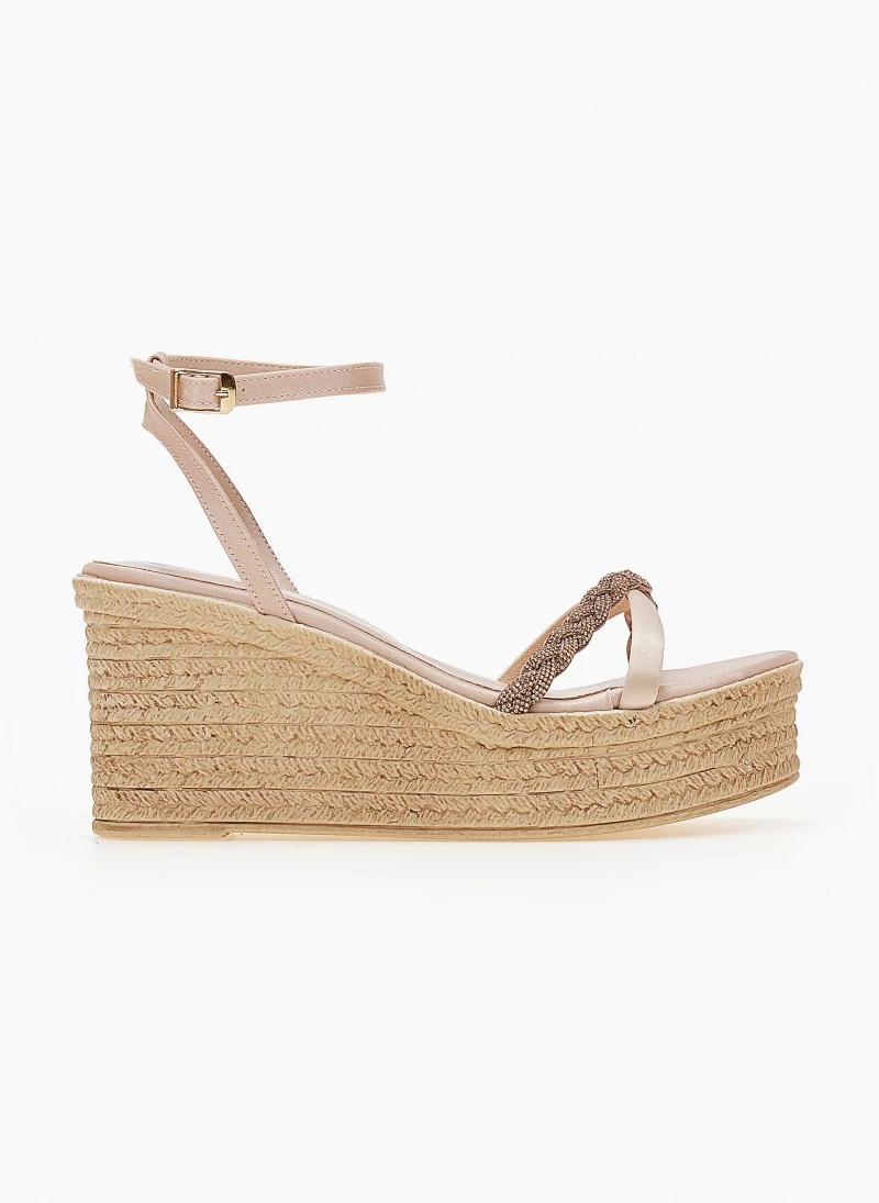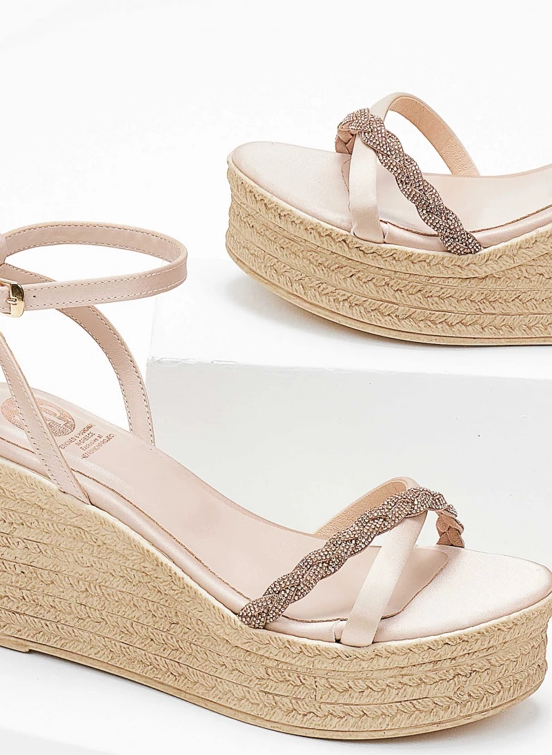 Πλατφόρμες σατέν TFP με strass κοτσιδάκι. Δένουν με μπαρέτα στο ύψος του αστραγάλου. Ελληνικής κατασκευής.