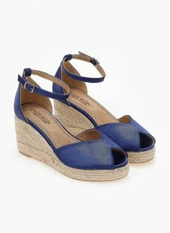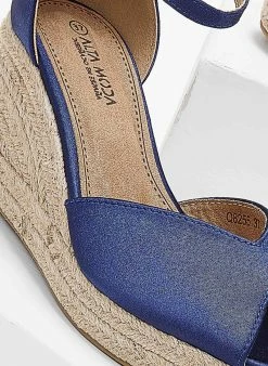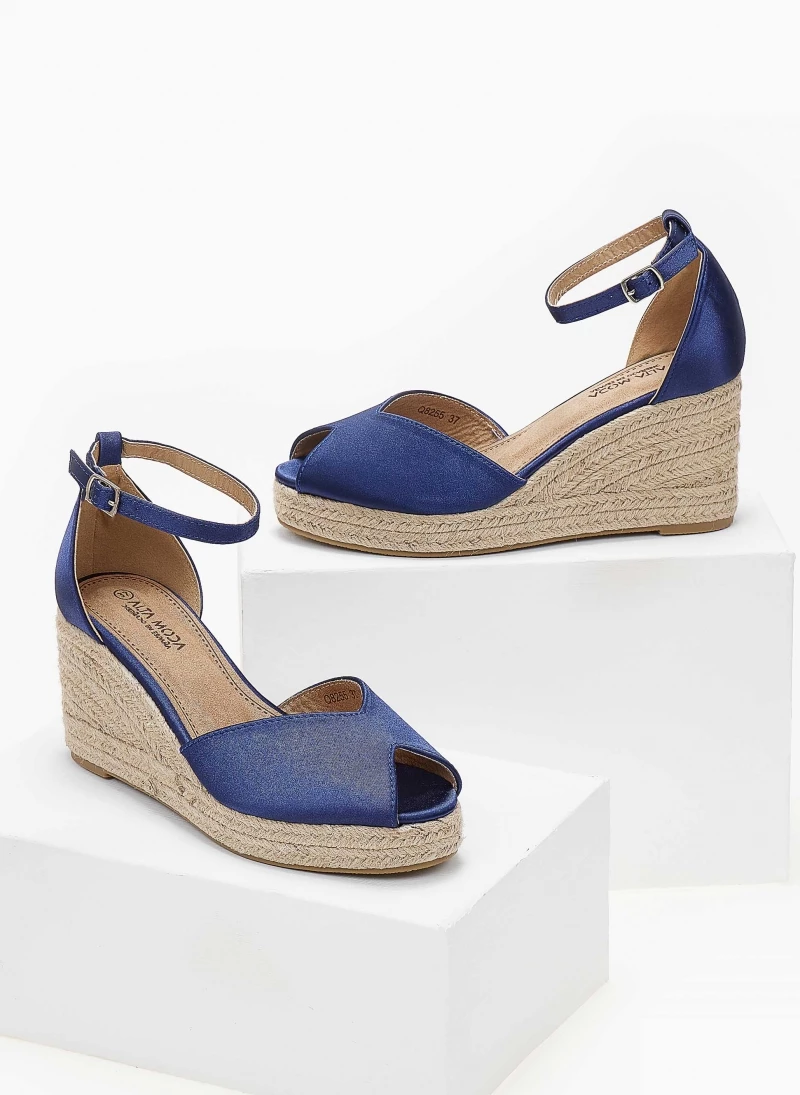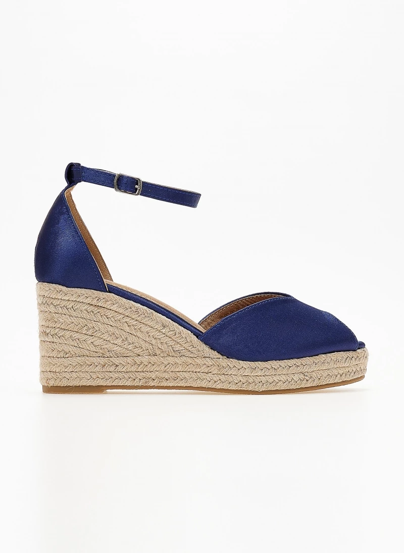 Πλατφόρμες σατέν με μικρό άνοιγμα. Έχουν κλειστή φτέρνα. Δένουν με μπαρέτα στο ύψος το αστραγάλου. Η σόλα είναι ντυμένη με σχοινί. Suede πάτος.