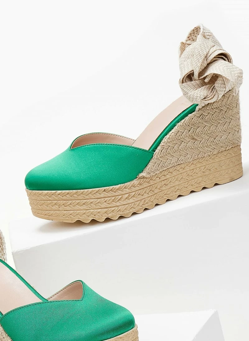 Πλατφόρμες Estil σατέν με λεπτομέρεια σχοινί στη σόλα. Έχουν lace up δέσιμο στη γάμπα. Ελληνικής κατασκευής.