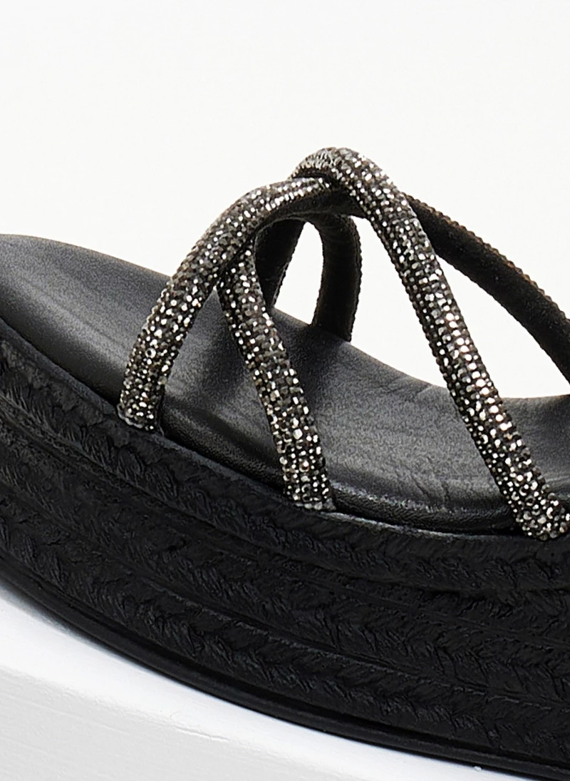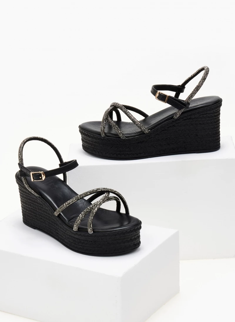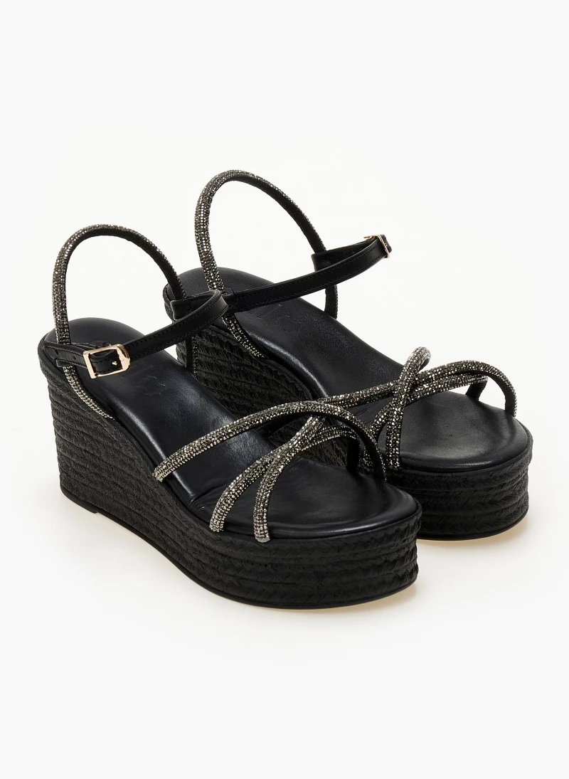 Πλατφόρμες δερμάτινες ESTIL με strass λουράκια. Δένουν με λουράκι στο ύψος του αστραγάλου. Δερμάτνος πάτος με ενίσχυση. Ελληνικής κατασκευής.