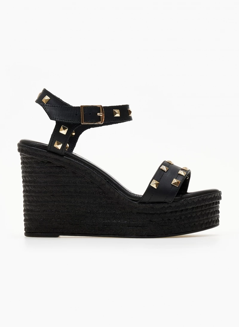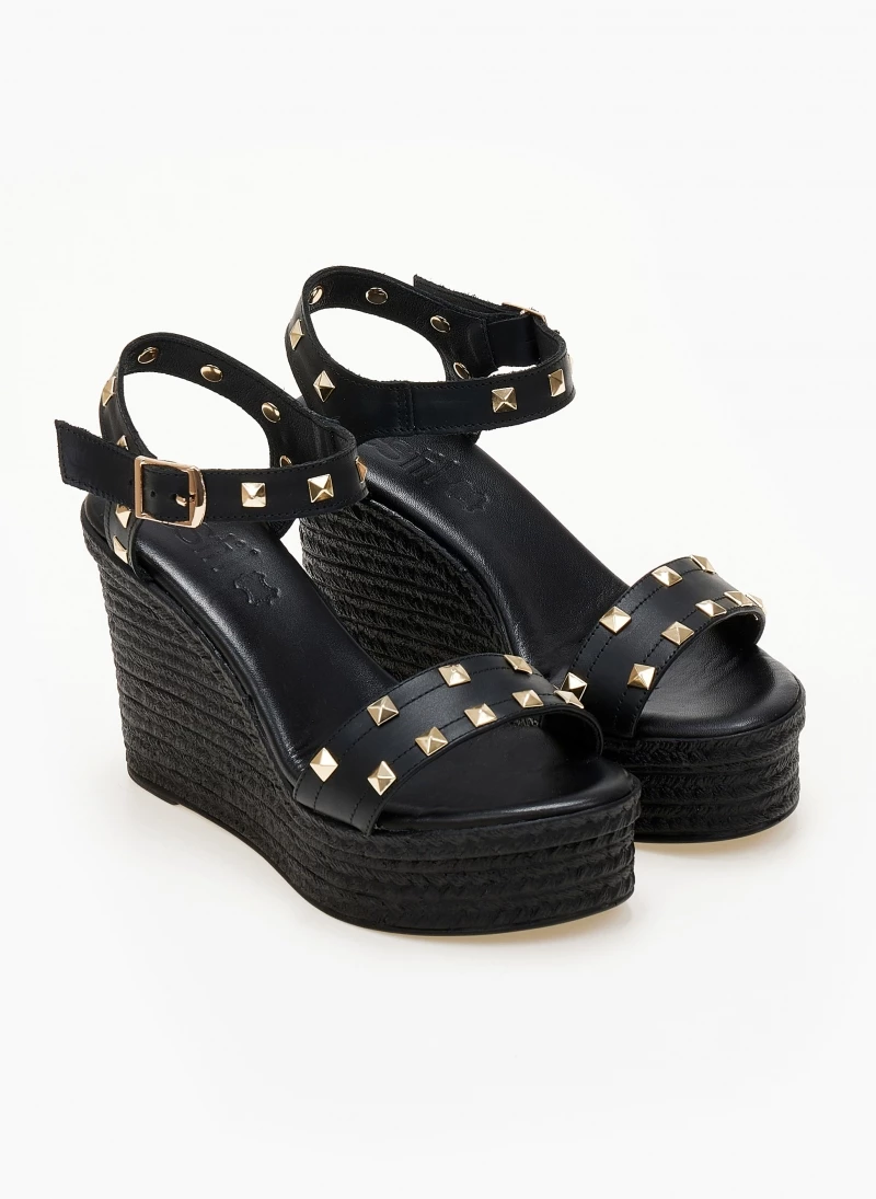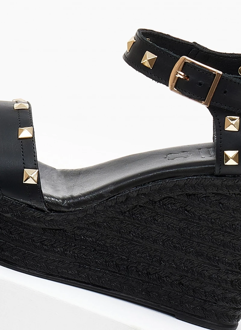 Πλατφόρμες δερμάτινες ESTIL με μεταλλικά τρουκς. Δένουν με μπαρέτα στο ύψος του κουτεπιέ. Δερμάτινος πάτος με ενίσχυση. Ελληνικής κατασκευής.