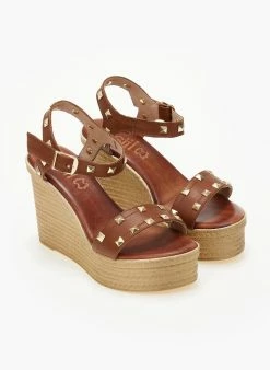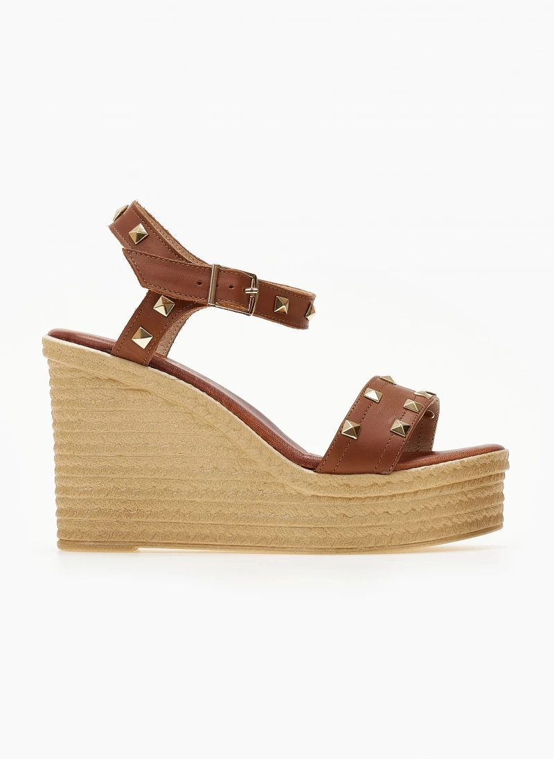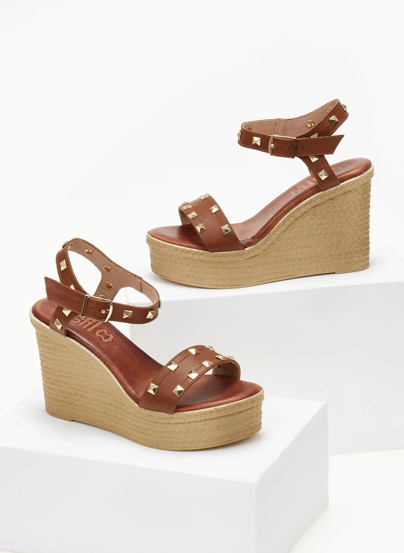 Πλατφόρμες δερμάτινες ESTIL με μεταλλικά τρουκς. Δένουν με μπαρέτα στο ύψος του κουτεπιέ. Δερμάτινος πάτος με ενίσχυση. Ελληνικής κατασκευής.